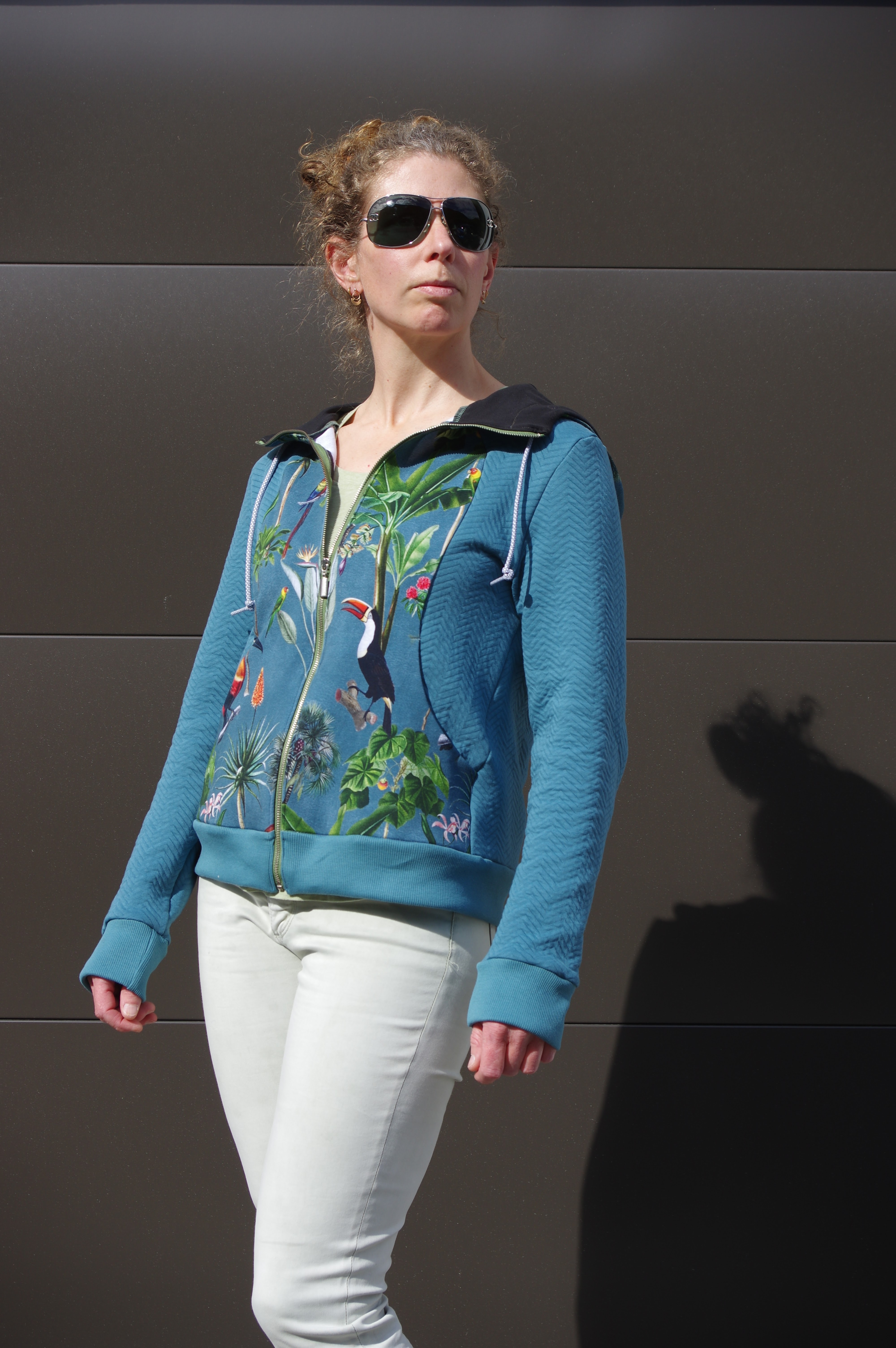 This is a pretty roomy hoodie and I actually recommend using a heavier weight sweatshirting for it. My fabric, which is french terry and the double knit, in my opinion, is borderline too thin. I also see that to up the quality of the finish, a twill tape edge on the zip side is really needed. I keep putting off learning how to do that. The instructions for this pattern have included that, so it was my laziness this time around.